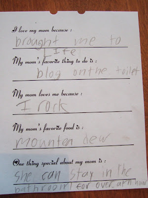 I found this note on the floor in the mudroom after the kids cleaned out their lockers. I think this might have been left over from Mother’s Day last year. The question is which one of my little darlings is so sweet and complimentary?